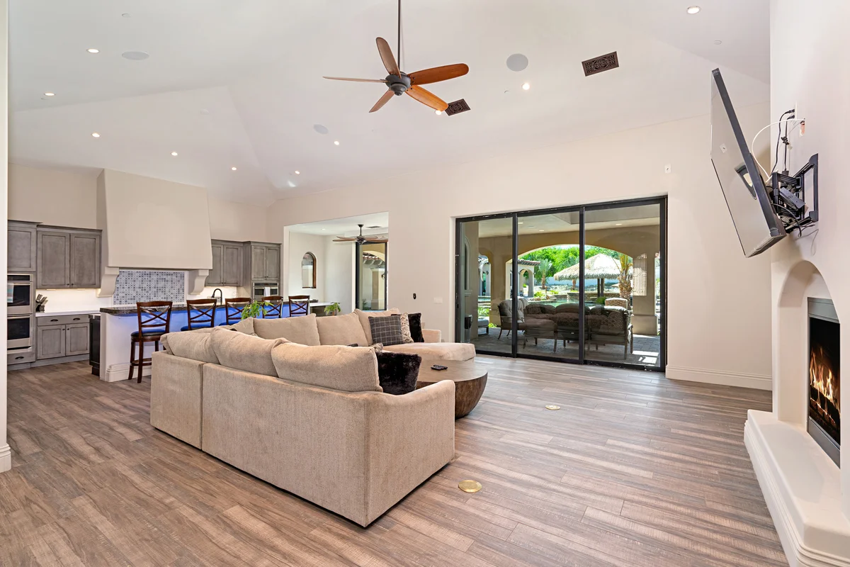 Swimming Pool with Waterfall Hot Tub / Poolside Palapa with Swim Up Bar / Built-In Wet Bar with BBQ / Outdoor Dining Area with Gas Fireplace / Outdoor Misting System / Bocci Ball Court / Horseshoe Pit / Professional Shuffleboard Table and Ping Pong Table / Lutron Smart Home System / Wi-Fi, Wall mounted I-Pad / Indoor-Outdoor Professional Sound System using SONOS / Nest thermostats / TV’s throughout using Direct Streaming.
